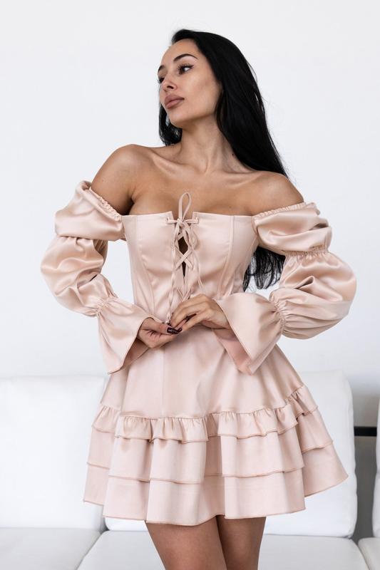 Короткое бежевое платье атлас с корсетом и юбкой с воланами