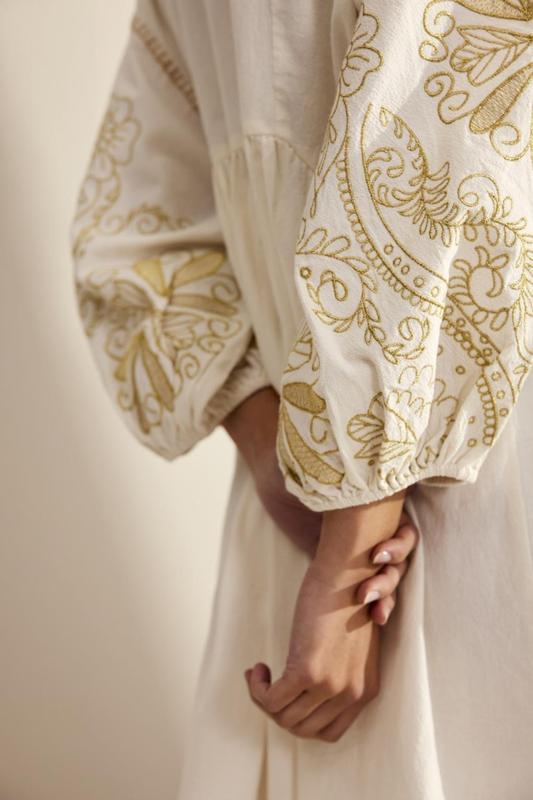 Ця чудова сукня від Summum Woman вишукано прикрашена чудовою золотою вишивкою. Коротке плаття оверсайз. Якість міцної та м'якої тканини. Рукава буфи та V-подібний виріз. Тканина 100% бавовна. Стан ідеальний. Розмір від XS до М Довжина-93см Ширина під руками-54см Рукав від горловини-60см