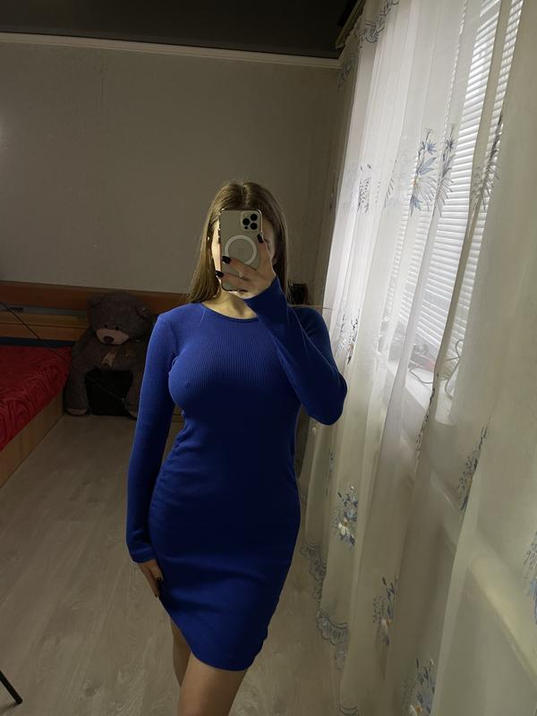 Приталена Сукня в рубчик На затяжках по боках В синем цвете Замеры на фото