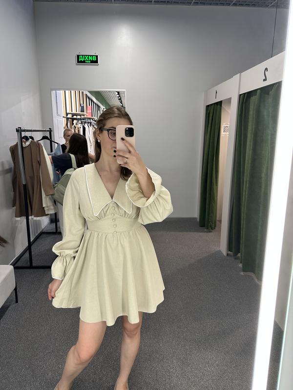 Платье с V-образным вырезом горловины. Спереди отложной воротник и декоративные пуговицы, которые обтянуты основной тканью. Длинные и объемные рукавами внизу собраны на резинку. Застегивается на молнию сзади. Без подкладки. Нова На сайте цена 1899