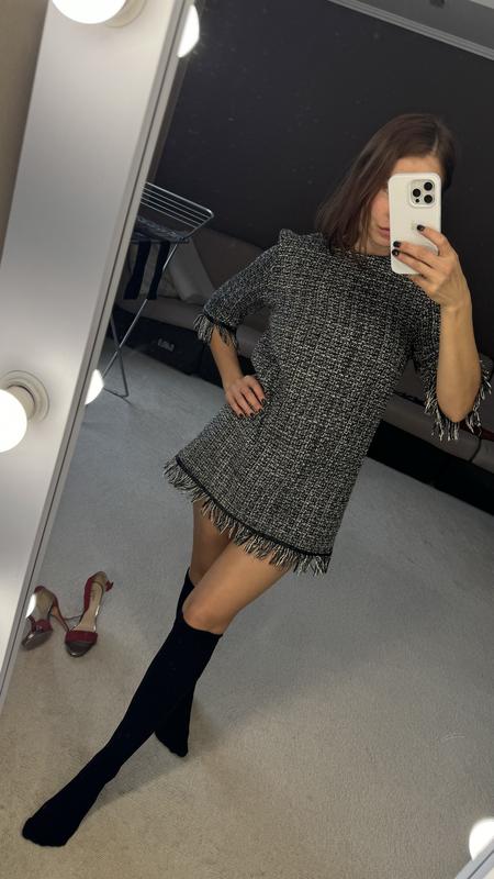 Трендовое платье из твида. Стильная классика и любовь всех девушек. Рост модели 161, вес 50. Платье подчеркивает ноги и скрывает живот, бока. Одним словом - такого платья больше нет ни у кого) можно с поясом или без него