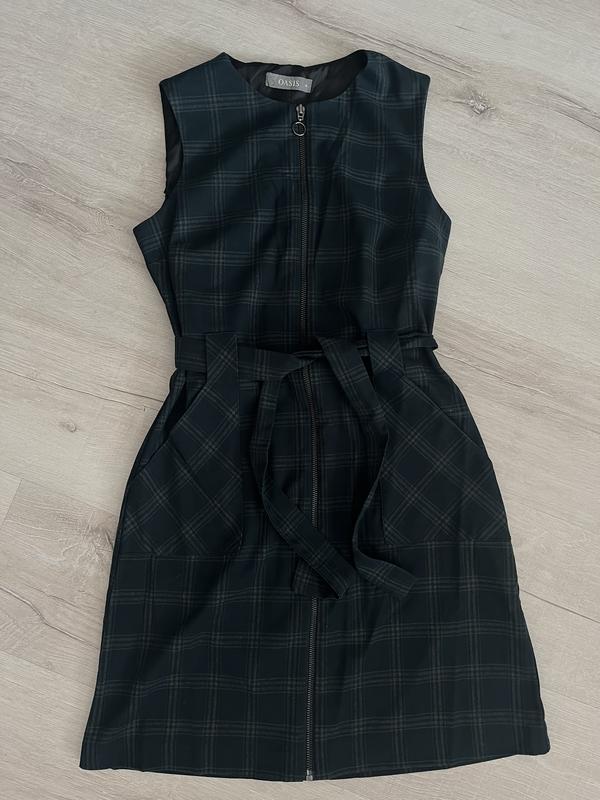 Платье темно-зеленое в клетку на замке, приталенный фасон Размер M Есть пояс и карманы Без недостатков