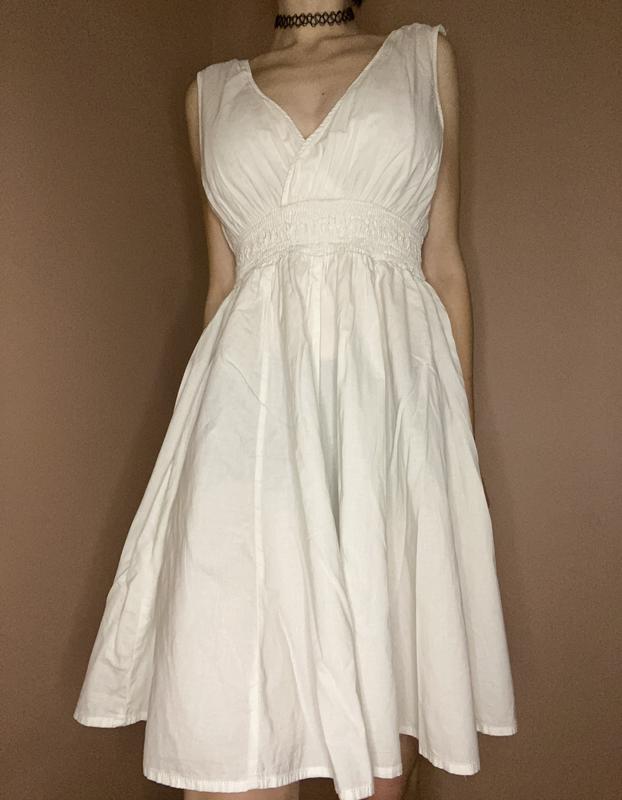 Білосніжна сукня, дуже легесенька, трохи просвічує. Розмір: M Зріст моделі 1.60 довжина: 87см талія: 30см тягнеться до 50см груди: 36см, чашки для досить великих грудей.
