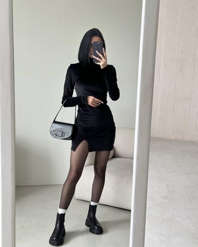 Стильное короткое платье имеет на ножку разрез. Горловинка стойка. Ткань качественный велюр, приятный к телу. Платье удобное. Размер: s-m(42-44); m-l(44-46) Цвет в наличии черный