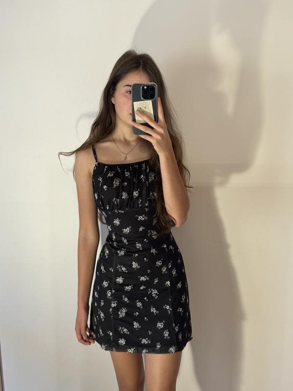 Легка чорна сукня з тонкими бретельками та ніжним квітковим принтом. Приталений силует підкреслює фігуру, а вільний верх додає комфорт. Ідеально підходить для повсякденних виходів або вечірніх прогулянок.