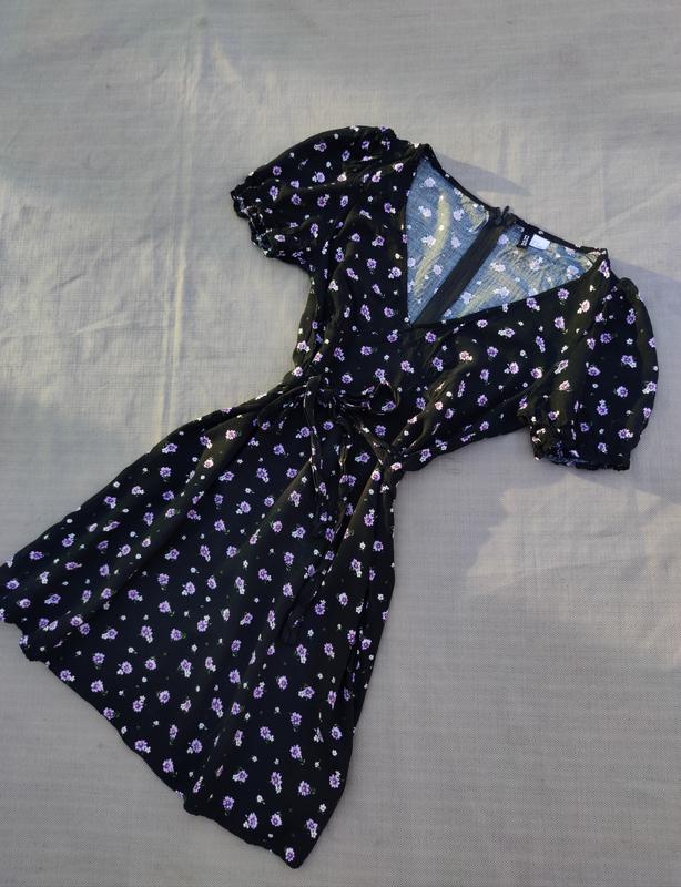 мини платье в цветочный принт, легкая, талия на пояску, сзади застегивается на молнию, v-образный вырез, ткань мягкая, приятная По бирке размер S Длина 85 см Пот 36 см Ткань 100% вискоза