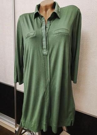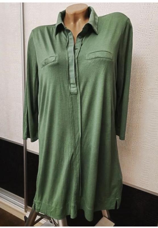 Можно надевать как удлиненную блузку или, как мини платье рубашку на невысокий рост Цвет оливковый. UK 14 48р Очень тонкий трикотаж,хорошо тянется Рукав 3/4 По бокам разрезы На спине плечи из прозрачной ткани. Длина по спинке 81см Плечи 42 см Рукав 46см Ширина между подмышками 54см Пот 57см Поб 60см Мерки не растягивая ткань