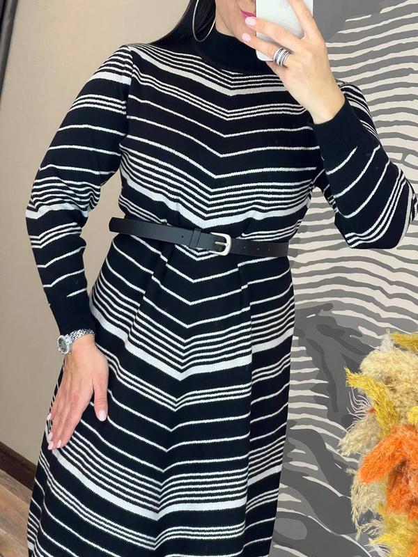 элегантное платье свободного, слегка расклешенного от талии силуэта, с аккуратным воротником стойка, длинными рукавами и поясом в комплекте, согреет вас в холодное время года и создаст хорошее настроение, оно выполнено из приятного на ощупь трикотажа машинной вязки, украшенного изящным принтом длина 98 см, полуобхват груди 48-50 см хорошо тянется, длина рукава от шеи 70 см размер универсальный 46-50 код 0459