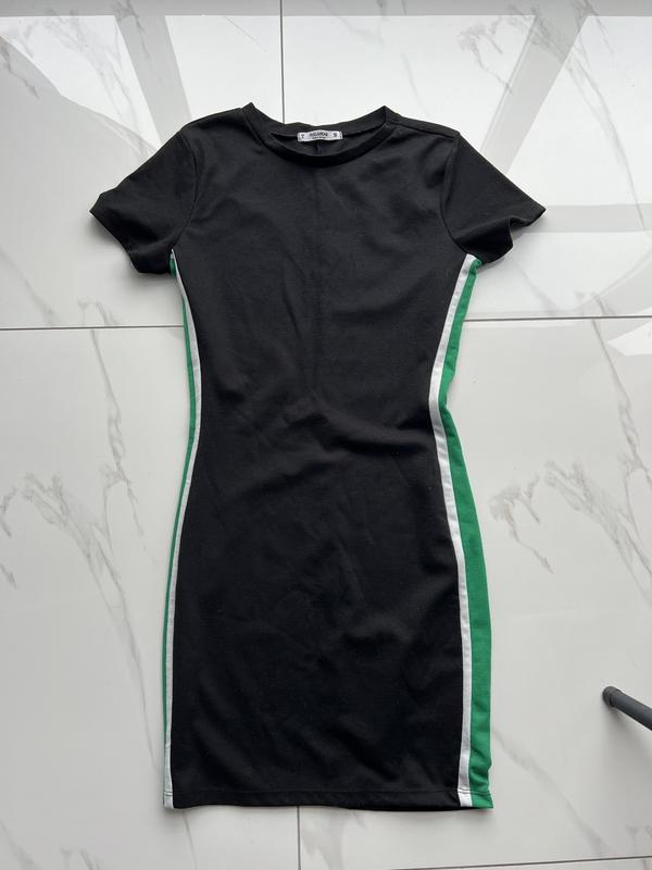 Черное платье с зеленым и белыми полосками по бокам. Размер указан S, но по факту лучше садится на XS или небольшую S