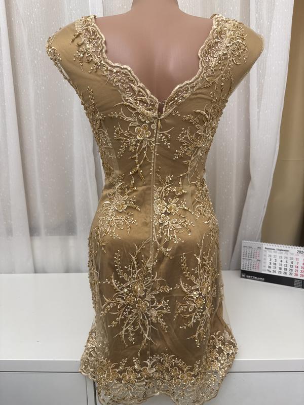 платье было пошито под заказ, из дорогой ткани с бисером и из натурального шелка подкладка, длина 80см, талия 32, грудь 42см.