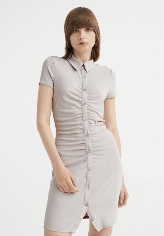 Код: 188 Женское платье в рубчик, фирмы H&M, состояние - новое, в бежевом цвете, размер M, ткань красиво тянется и приятная к телу, 91% полиэстер, 9% эластан Длина 88 см, в плечах 36 см, в груди 46 см, в бедрах 45 см, в талии 35 см