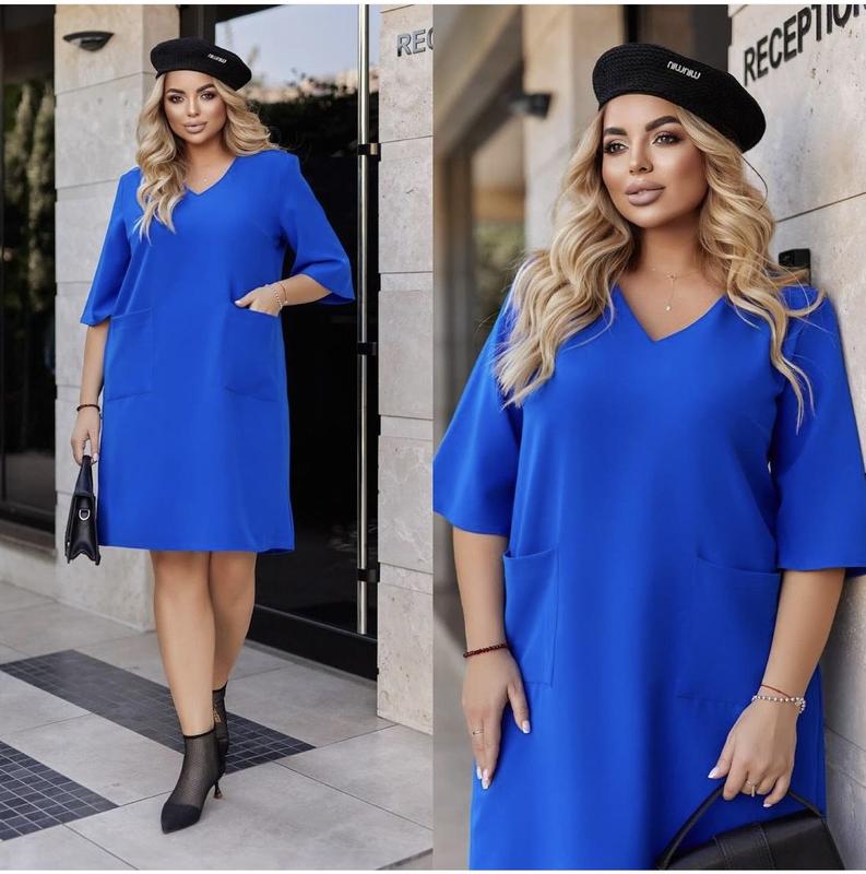 Розмір: 62-64, тканина- крепкостюмка. Сукня вільного крою з V-образним вирізом на грудях, по бокам дві кишені. Заміри: ОГ-140 см., ОТ-144 см., довжина рукава -40 см., біцепс - 46 см., плечі 51 см., довжина сукні - 102 см., ОБ-144 см.