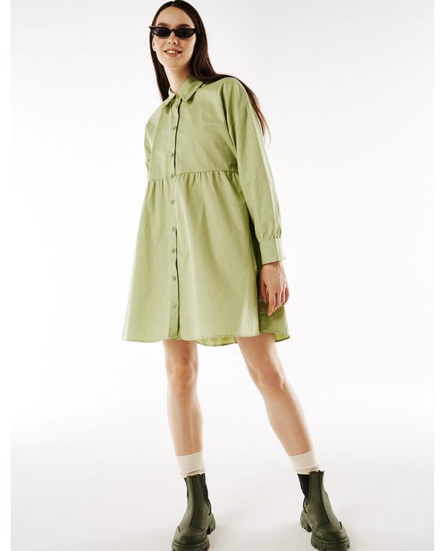 До Стан:Идеальный Размер подходит от S до M-L Хлопковое платье Baby Doll. Силуэт беби долл. Классическая форма воротника. Застежка на пуговицы спереди. Повышенная линия талии. Длинные рукава. Длина мини. Длина изделия спереди: 88,2 см (для размера S). Размер модели на фото: S (26/32). Рост модели на фото: 173 см. Параметры модели на фото: грудь: 78 см; талия: 60 см; бедра: 87 см. Страна производства: Бангладеш.