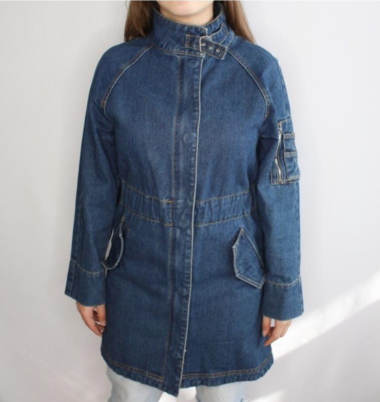 Универсальная джинсовая куртка,жакет, застежки на молнию и кнопки, с карманами, пояс под шнурок, сзади разрез, без нюансов Размер указанный S Замеры на фото
