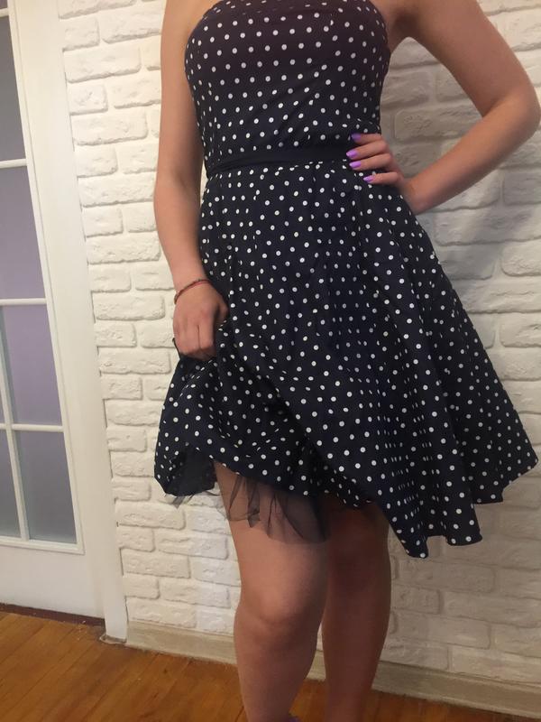 Платье темно синего цвета в белый горошек, без бретелек, юбка на подкладке. Длина 74см, по талии 78см, по лифу 88см{ лиф на резинке}