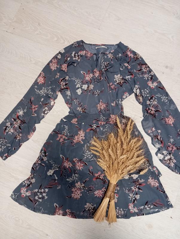 Платье с подкладом ( кроме рукавов) в цветочном принте Размер М На рукавах и по низу изделия есть рюш. На талии резинка. У горловины завязки Замеры: Длина 90 см Пол об 50 см Полу ог 50 см