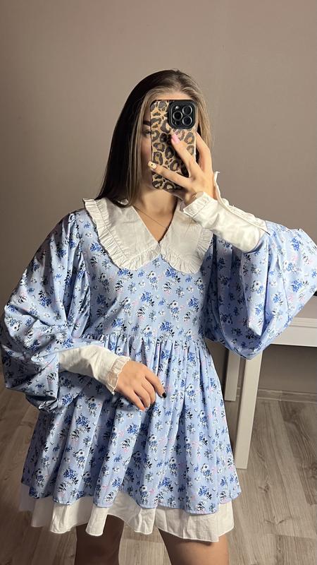 Сукня у квітковий принт з білим комірцем, обʼємними рукавами знизу на ґудзиках, і подвійною спідницею Тканина: котон, софт Розмір: М-Л Заміри: Обхват грудей - 90-105 см Обхват талії 65-80 см Довжина - 83 см Сукня в ідеальному стані, вдягалася 3-4 рази
