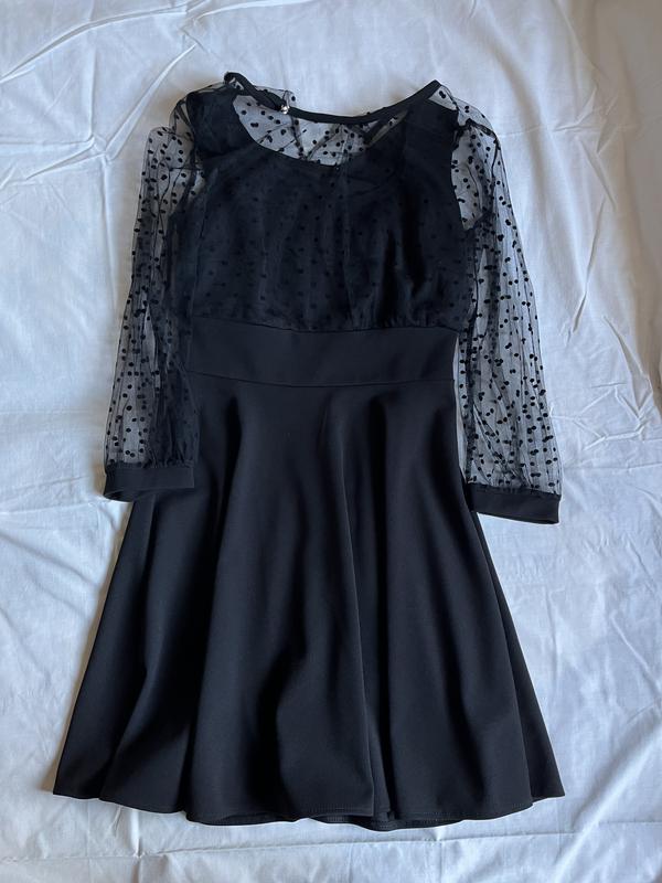 Платье черного цвета в горошек на подкладке, рукав три четверти Состояние как новое, одевала 1 раз)