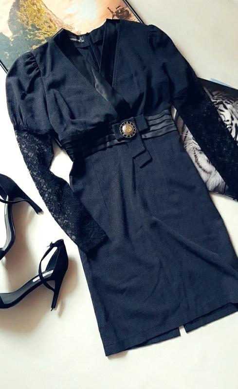 Теплое платье темно серое рукав-фонарик, кружевной атласный воротник, с брошью. S/ 36 Стан 5/5