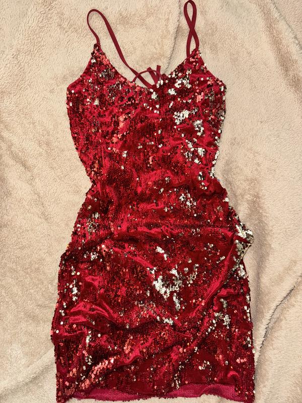 Красное бархатное платье в пайетки. Пайетки двухсторонние красные-серебристые. Очень красиво садиться по фигуре, на спинке шнуровка. Есть подкладка, так что будет комфортно в носке. Размер с-м. Длина 80см.