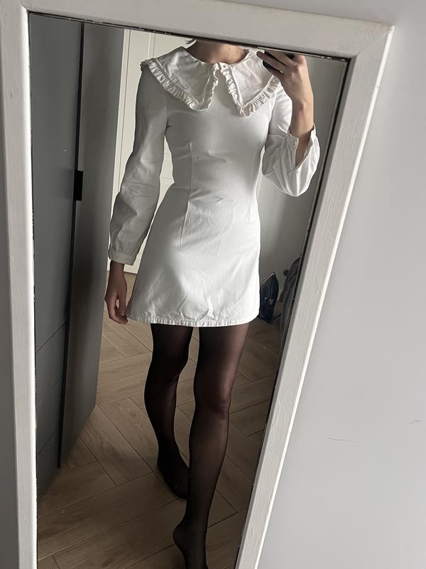 Белое платье от Asos из качественного плотного денима Украшена красивым воротничком Размер S, небольшая M В составе 100% хлопок Длина мини