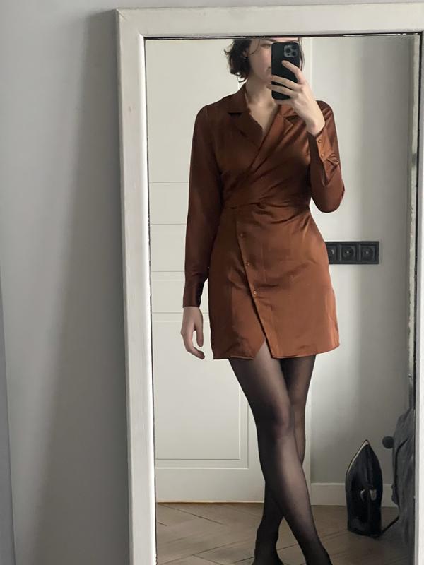 Красивое платье длины мини от бренда Nasty Gal Ткань - искусственный атлас, в составе полиэстер Отлично садится по фигуре, на запах, регулируется поясом Есть небольшой дефект на рукаве, почти не заметный в носке, легко можно подкорректировать