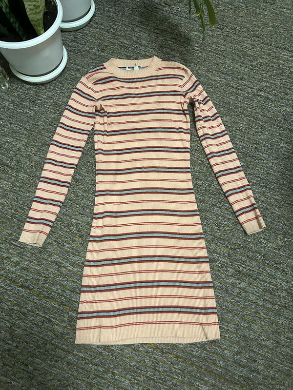 Теплое персиковое платье средней длины в полоску с длинным рукавом в утяжелике m l