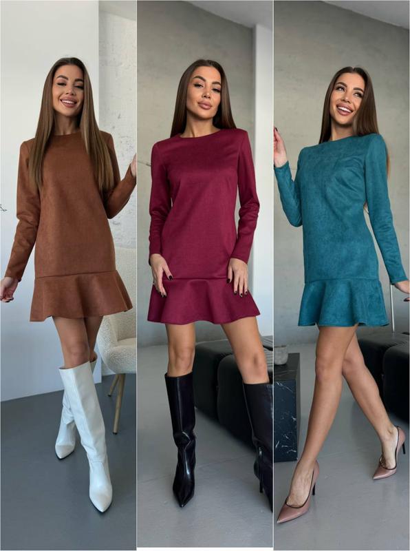 Платье Мод 710 Ткань - замш на дайвинге Цвет - морская волна, кемэл, бордовый Размер: S-M, L-XL На спинке потайная молния Длина рукава 60 см Длина 85 см