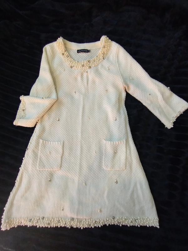 Очень красивое платье туника имеет карманы украшена камушками и бутиками сбоку и ссаду не хватает камушков. Длина 80 см Ширина по груди 43см По бедрах 50 см Плечи 33 Рукав укороченный 46 см
