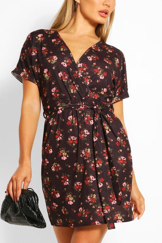 Летнее платье на запах с цветочным принтом Бренд: BOOHOO; Цвет: черный; Состав: вискоза, эластан; Размер: UK 16/L/ 48; ОГ: 104 см; ОТ: 86 см; ОБ: 111 см; Длина: 81 см. Арт.: 22543