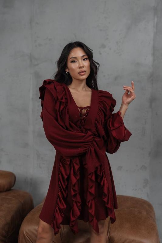 Сукня Арт 7037.6 💥Цена 1149 грн - Бордо Цена 1349 грн - софт шелк с кружевом Материал трикотаж с люрексовой нитью. Имеет легкий блеск, хорошую растяжимость. Свободное платье. На талии резинка. декор - Роскошные воланы. Кокетлевое Декольте можно сделать более - менее закрытым за счет шнуровки. Оригинальный современный крой делает платье незабываемым. 🔹42-48: ОГ 113, ОБ 125 🔹50-56: ОГ 130, ОБ 145