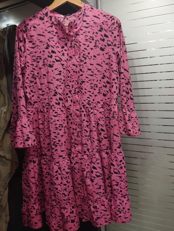 розовое с модным принтом платье трапеция, рукава воланами 3/4