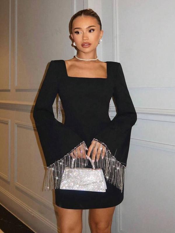 Размерный ряд:S,M,L,XL Очень красивое и нарядное платье, с стильными в этом сезоне подвесками по рукавам и спинке 💫 Застегивается верх на пуговицы, по спинке молния