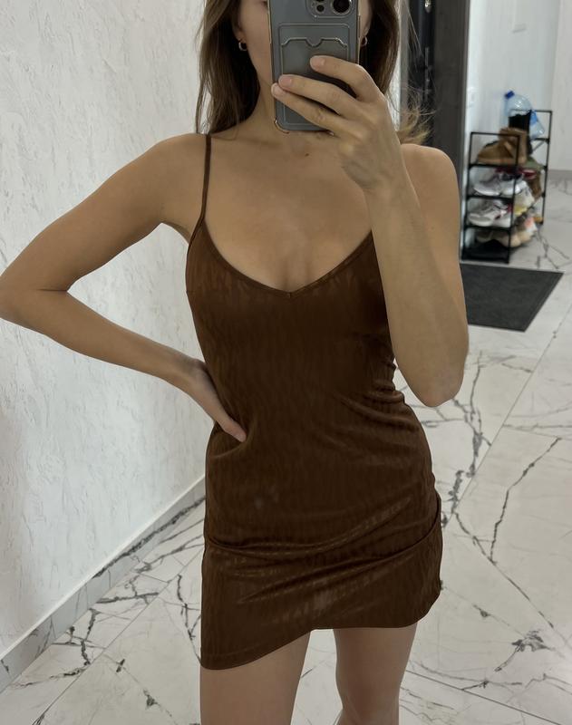Сукня з трикотажу (склад поліестр) Колір коричневий, застібажться на блискавку с боку Ог-74, от-62, ос-82, довжина-73 см