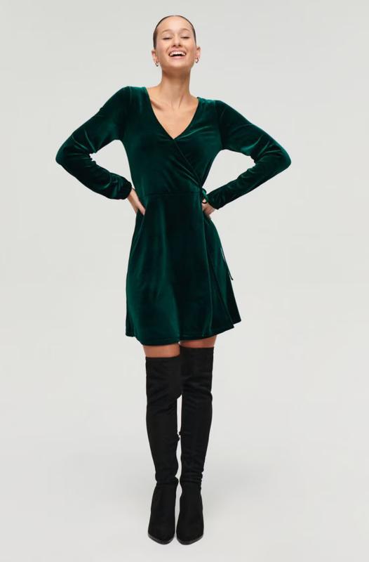 Платье с запахом велюровое, было куплено в house через интернет, оказалось недостаточное, ни разу не надеваемое, только на примерку. Очень красивый цвет изумрудный, платье мини, не слишком длинная