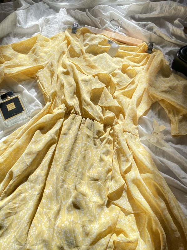 Желтое летнее платье с цветочным принтом, вырезом на груди и оборками, размер l.