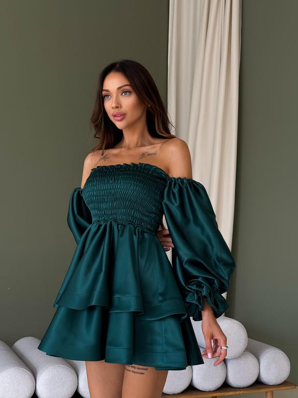 Атласное платье с пышной юбкой и объемными рукавами, атмосферное платье с резинкой на груд...