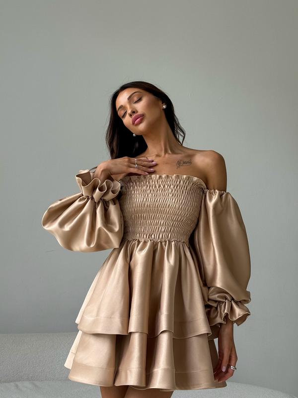Атласное платье с пышной юбкой и объемными рукавами, атмосферное платье с резинкой на груд...