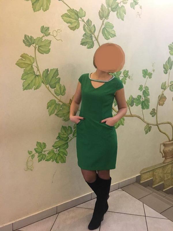 Плаття смарагдового кольору оздоблене перлинками. Плаття шилось на замовлення по параметрах розмір Л.Додатково скину всі потрібні заміри.Тканина габардин з підкладкою .Стриманий і цікавий крій .