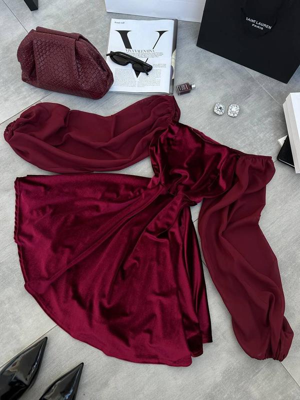Платье мини короткая праздничная бархатная с длинными объемными шифоновыми рукавами бархат...