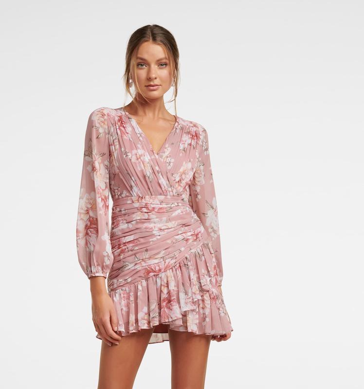 Розовое платье с цветочными складками имеет: приталенный силуэт Завернутый лиф Шелковистое тканое исполнение Мини-юбка с воланами Эластичный пояс сзади Прозрачные рукава-баллончики по всей длине Потайная боковая застежка-молния Состав продукта: Основная часть: 100% полиэстер. Подкладка: 95% полиэстер, 5% эластан< размер платья Размер: EUR 38/М/S