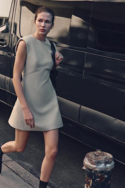 Цена 1870 Платье с круглым вырезом и рукавами без рукавов с подплечниками. Деталь ткани с эффектом блеска. Застежка на спине с потайной молнией в шве. Жемчужно-серый <unk> 9063/587