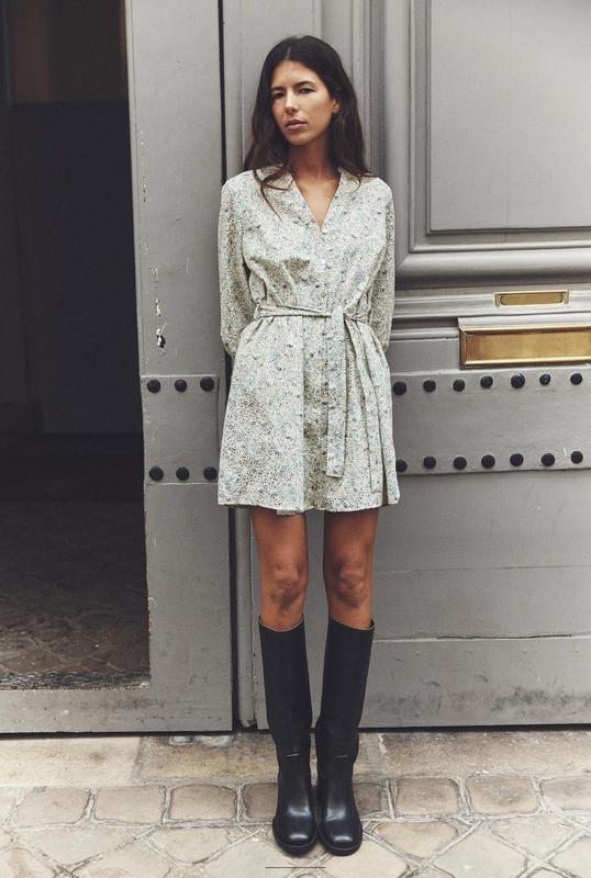 Сукня з прорізним коміром, пишними рукавами, що опускаються нижче ліктя з еластичною обробкою, поясом з тієї ж тканини та гудзиками спереду. 📎Розмір XS