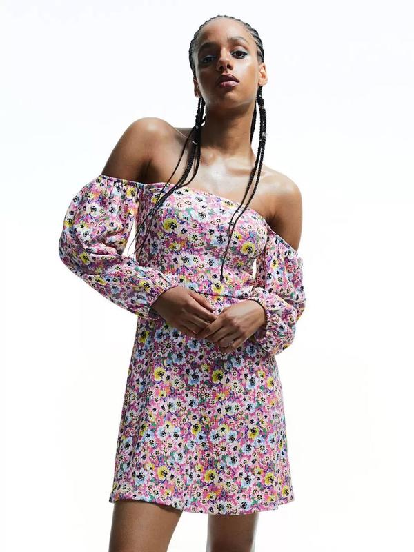Красивое платье со спущенными плечами, подойдет на размер S-M,стан новой вещи (обедалось только раз) Длина-68 Полуобхват груди-33 Полуобхват талии-34,5