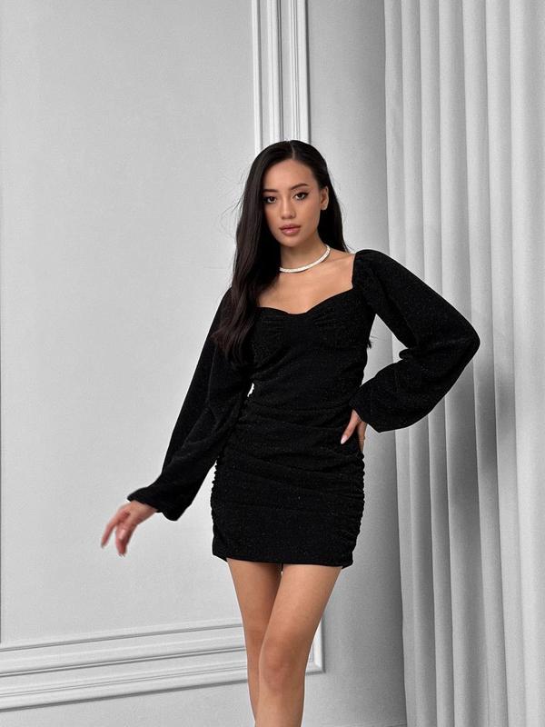 #073 Ткань :трикотажный люрекс Цвет:черный Размеры :42-44;46-48 Универсальное черное мини платье из люрекса. По бокам платья идет сборка, грудь подчеркнута рельефным лифом. Объемные рукава добавят романтичности в твой образ, а фасон платья сделает фигуру очень соблазнительной