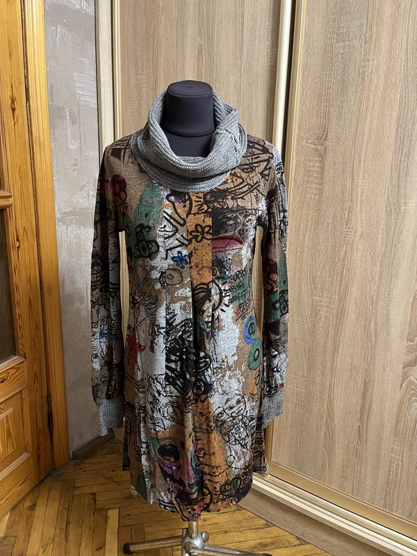 Теплое платье с вязаным воротником хомутом и вязаными манжетами. Стан идеален. Без бирки, состав неведомый
