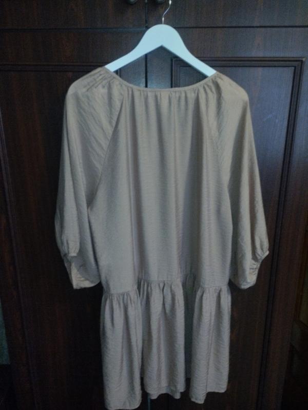 Платье-туника батал темной пудры цвета,кругом шеи присборенная,рукав пышный регланом за локоть присборенный,силуэт прямой,до низа большая оборка, очень воздушное.Моженная под пояс.Ткань вискоза,полиэстр,длина 92 см,плечипо54-56,ПОГ63 см