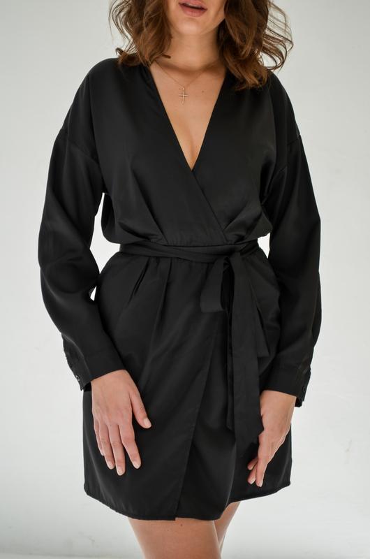 Платье с имитацией запаха и поясом. В наличии три цвета: черный, пудровый, изумрудный. Размер S-M. Состав: 65 вискоза, 35 полиэстер.