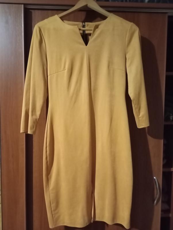 платье футляр деловой стиль. притупленное, на спине на молнии застежка. приятная плотная ткань велюр. бежево-желтый приятный цвет. размер M-L. при необходимости, отправлю замеры. состояние идеально.
