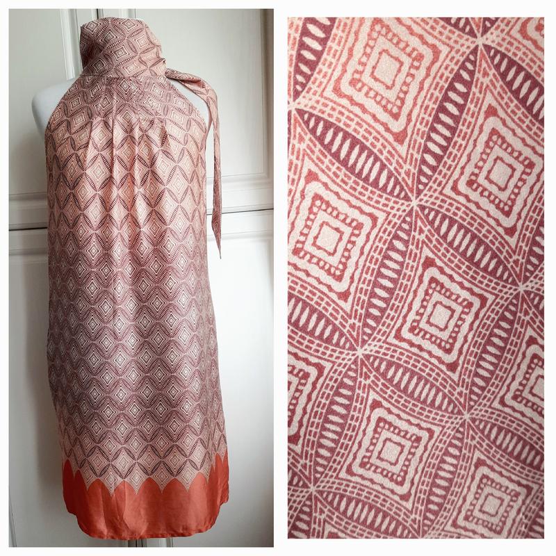 Sinequanone шелк платье M-L 46-48 без рукавов Платье M-L 46-48 шелка SINEQUANON Франция без рукавов ворот бант с узором в виде оранжевых и амарантовых ромбов на кремовом фоне градиент бежевый подол оранжевый есть пояс стиль 20х годов романтичное нарядное элегантное состояние идеальное замеры на фото